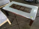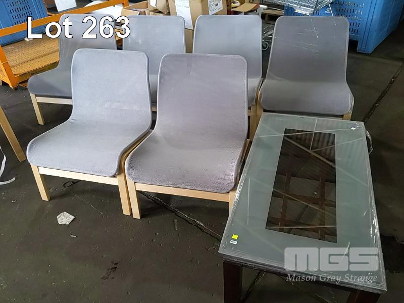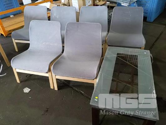 6 x IKEA "NOLMYRA" BIRCHWOOD EASY CHAIRS IN GREY AND GLASS TOPPED COFFEE TABLE.