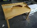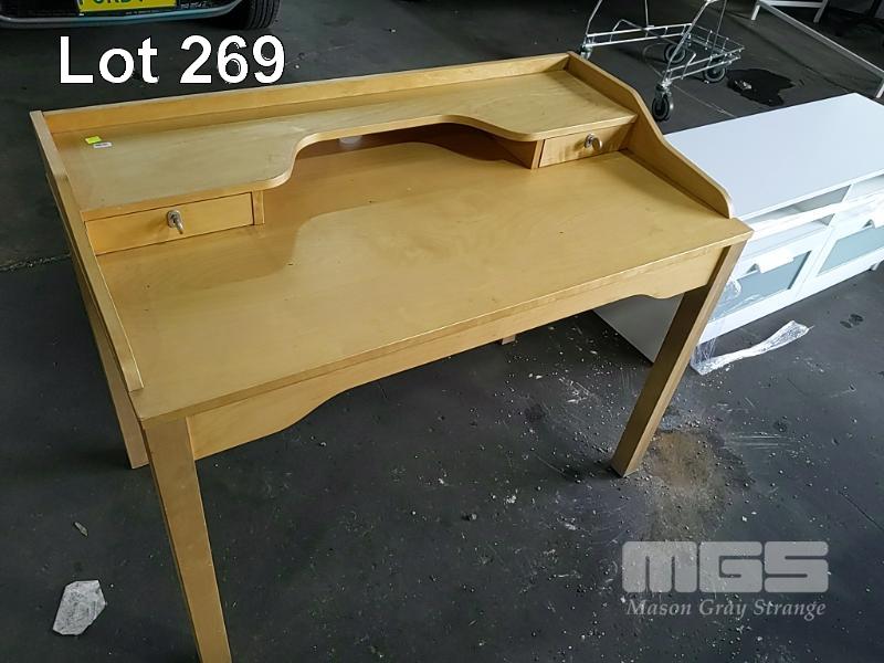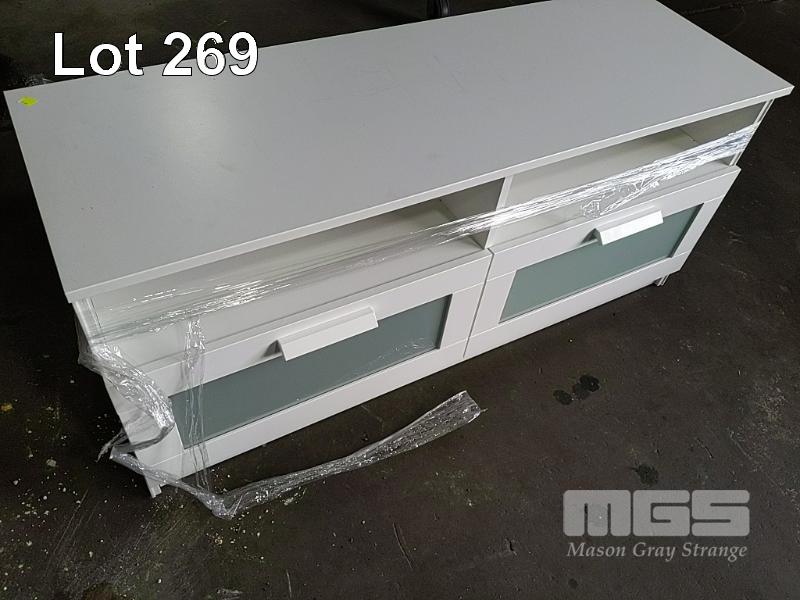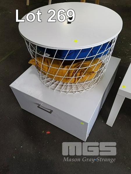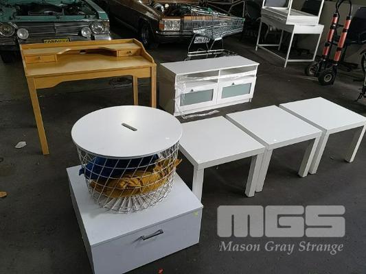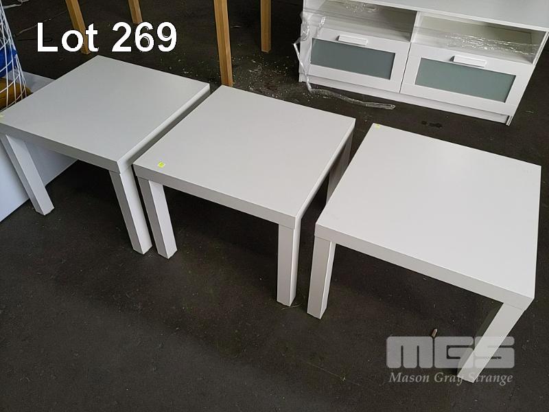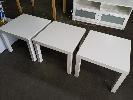 COLLECTION OF WAITING ROOM FURNITURE. IKEA "GUSTAV" BIRCHWOOD DESK/DRESSING TABLE, IKEA "BRIMMES" TV BENCH, 3 x IKEA "LACK" SIDE TABLES IN WHITE, IKEA "KVISTBRO" STORAGE TABLE WITH 2 x THROW CUSHIONS AND SINGLE STORAGE DRAWER IN WHITE.