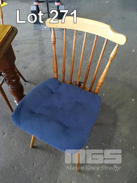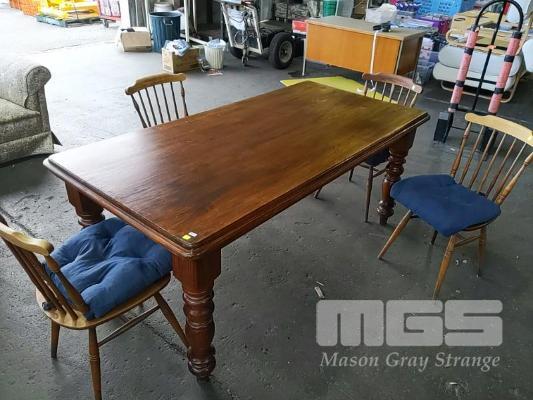 6-PLACE TEAK STAIN DINING ROOM TABLE AND 4 x COTTAGE SPINDLE BACK CHAIRS WITH BUTTON CUSHIONS.