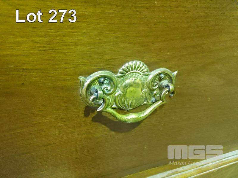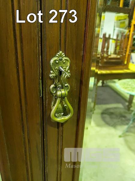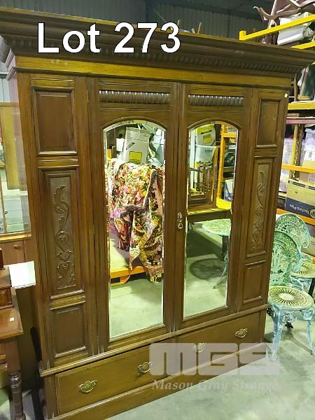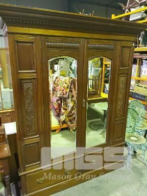 ANTIQUE 2-DOOR WARDROBE WITH CARVED FEATURES, MIRRORED DOORS AND 2-DRAWER UNDER STORAGE (PARTS OF THE CORNICE ARE OFF BUT PRESENT).
