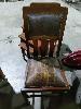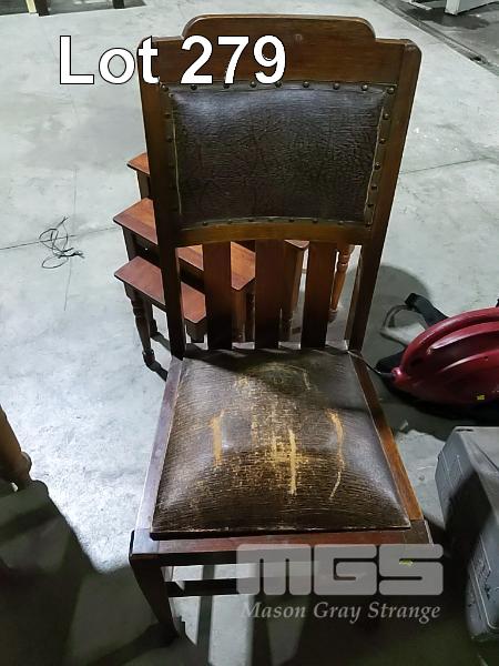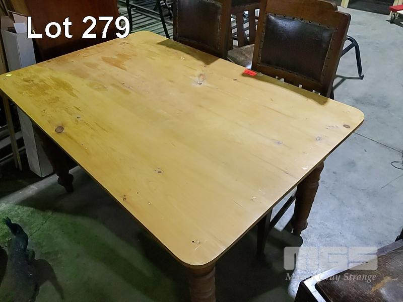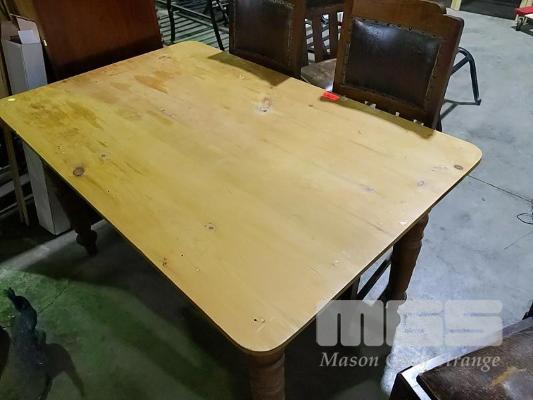 RAW TIMBER DINING TABLE AND 4 X VINTAGE HIGH BACK SOLID TIMBER DINING CHAIRS WITH LEATHER SEATS