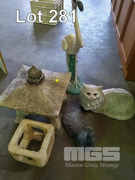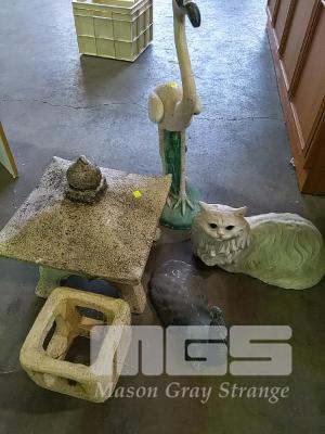 GARDEN ORNAMENTS INCLUDING FLAMINGO, CAT, PEACOCK, CHINESE PAGODA ETC.