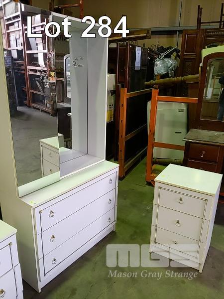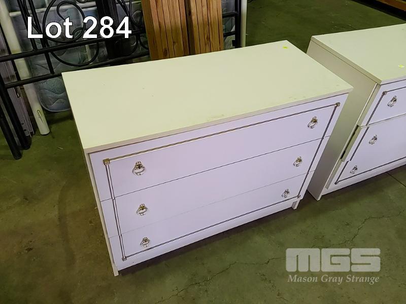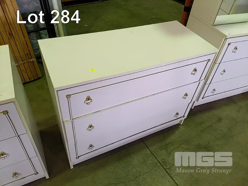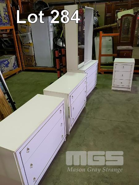 4-PIECE QUEEN ANNE STYLE BEDROOM SUITE IN WHITE COMPRISING 2 x 4-DRAWER CHEST OF DRAWERS, 3-DRAWER SIDE TABLE AND 4-DRAWER WALL UNIT.
