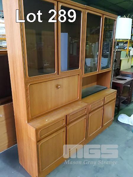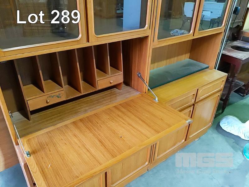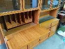 2 x CIRCA 1970S TIMBER WOOD GRAIN WALL UNITS WITH SMOKED GLASS DOORS, SMOKED GLASS SHELVES, UNDER STORAGE AND BUREAU IN ONE.