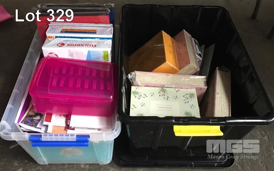 2 X TUBS CONTAINING OFFICE STATIONARY & SUPPLIES, TRIVIAL PURSUIT, GENIUS 2 EDITION & GIFT BOX SETS