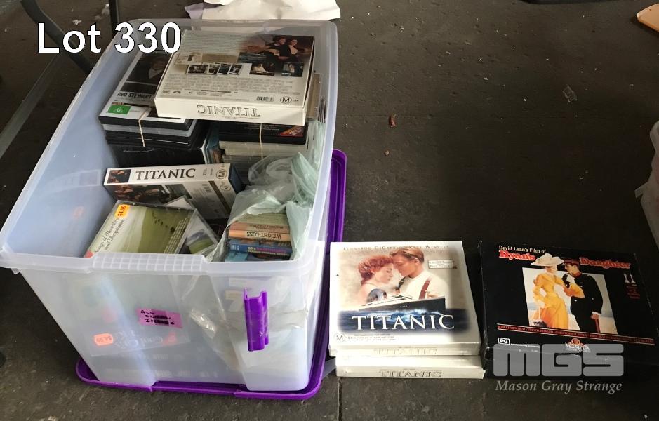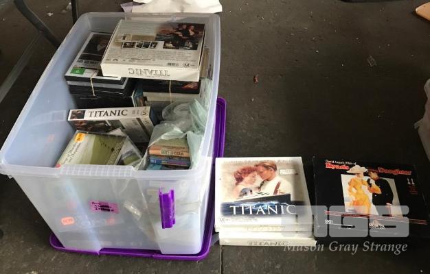 1 X TUB OF ASSORTED DVD TITLES, INC TITANIC, CLASSIC, VHS VIDEOS & CASSETTES
