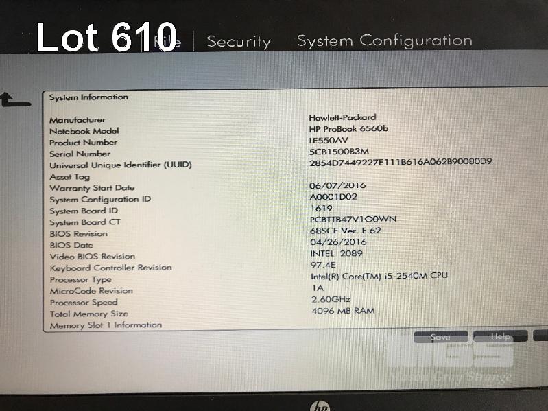 LAPTOP, HP PROBOOK 6560b (LE550AV), CORE i5 2540M (2ND GEN) @ 2.6GHz, 4GB DDR3 RAM, 250GB SATA HDD, DVD-RW, 15.6" WIDESCREEN (1366x768), INTEL HD VIDEO, Wi-Fi, BLUETOOTH, WINDOWS 7 PRO INSTALLED W/ LICENSE & POWER SUPPLY (NOTE: SCREEN LATCHES MISSING) S/N:5CB1500B3M