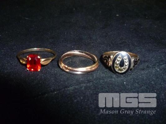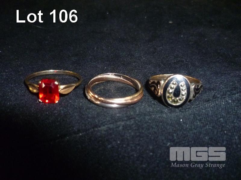 3 X GOLD RINGS, MARKED 9CT, 1 X CYGNET STYLE WITH HORSE SHOE DESIGN 3.5 grams, 1 X SET WITH RED STONE 1.4 grams 1 X 3 TONE GOLD, YELLOW, ROSE & WHITE 2.6 grams TOTAL WEIGHT 7.5 grams