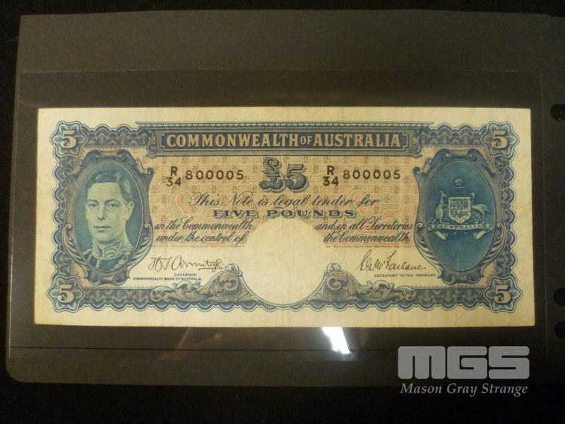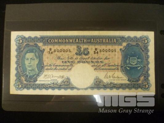 1942 5 POUND NOTE 1ST PREFIX "R34" ARMITAGE MCFARLANE APPEARS HIGH GRADE