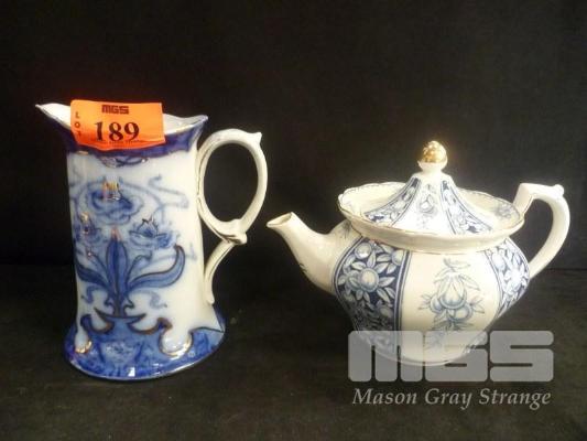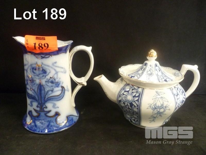 ENGLISH BLUE/WHITE SOHO, COBRIDGE JUG & BLUE/WHITE FINE CHINA VALENCIA TEAPOT