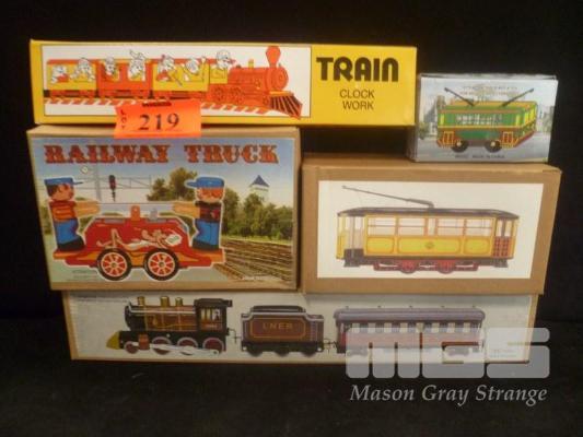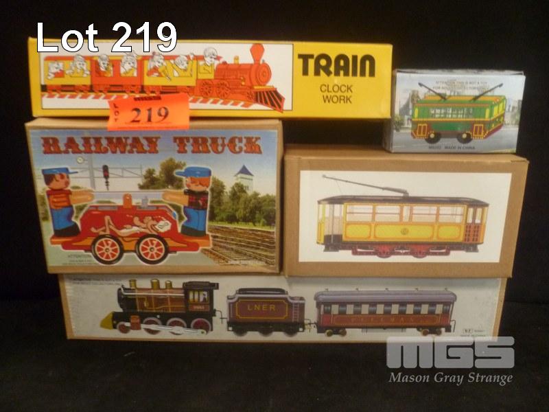 5 x WIND UP TIN TRAINS INC PULLMAN CNER TRAIN CLOCK WORK, RAILWAY TRUCK & ELECTRIC TRAMS