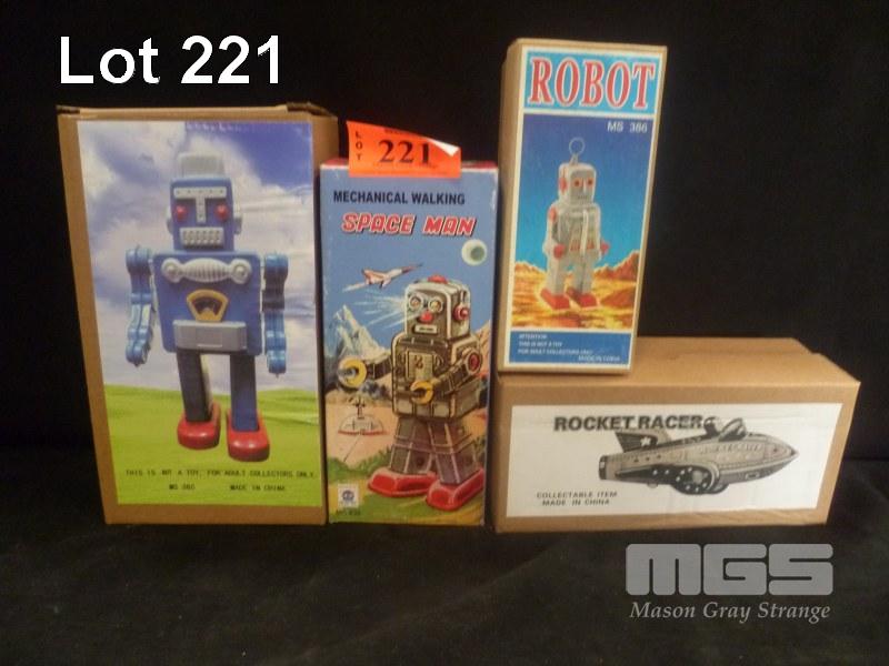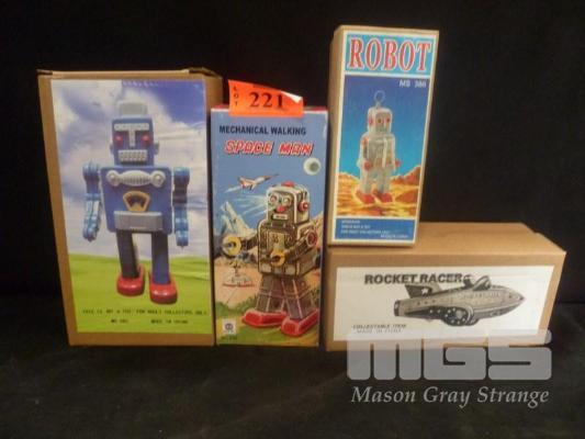 4 x WIND UP TIN ROBOTS INC MECHANICAL WALKING SPACEMAN, ROBOT MS386, BLUE ROBOT & ROCKET RACER