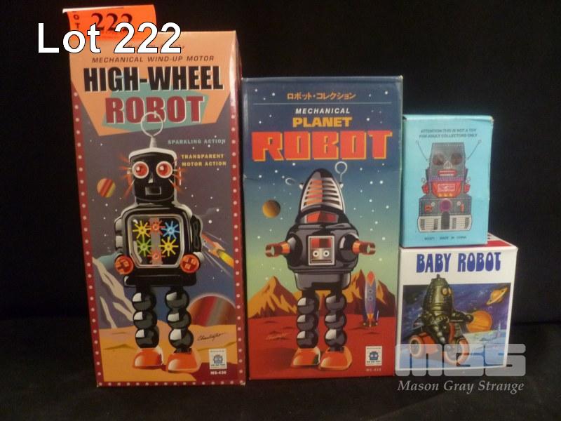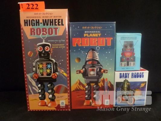 4 x WIND UP TIN ROBOTS INC MECHANICAL PLANET ROBOT, HIGH WHEEL ROBOT, R1 & BABY ROBOT