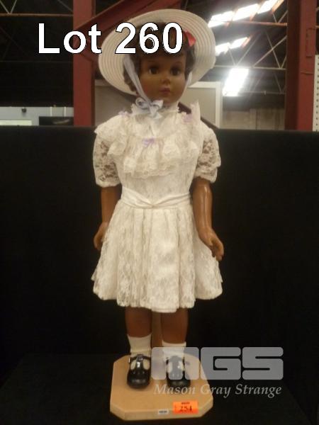 EARLY DRESS DOLL ON STAND, LACE DRESS, SHOES & HAT,MARKED AE3651 TO REAR OF HEAD