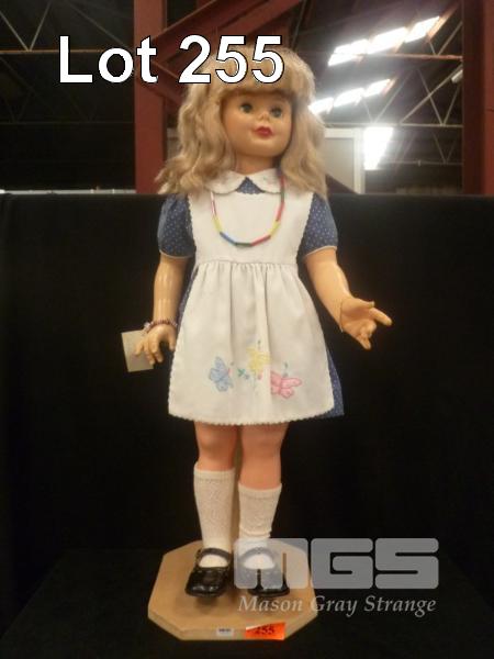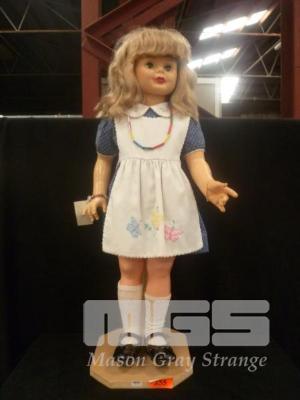 EARLY DRESS DOLL ON STAND, CIRCA 1950'S, AMERICAN SAYCO, WITH BLUE DRESS, APRON,SHOES, NECKLACE & BRACELET
