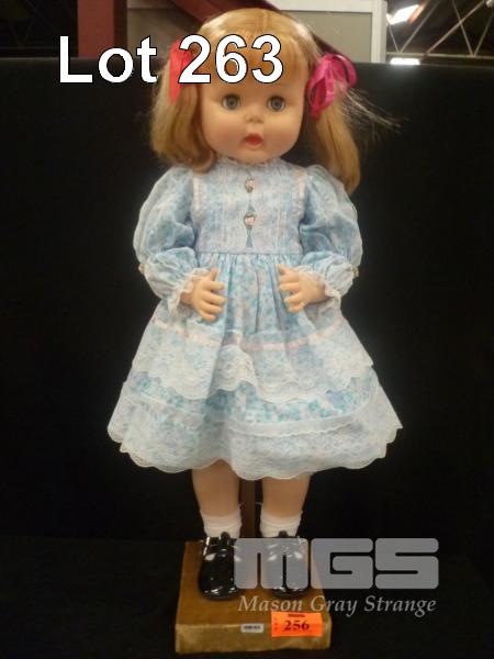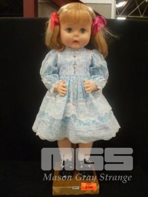 DOLL ON STAND, FLORAL & LACE DRESS, SHOES & PIGTAILS, MARKED MADE IN CHINA