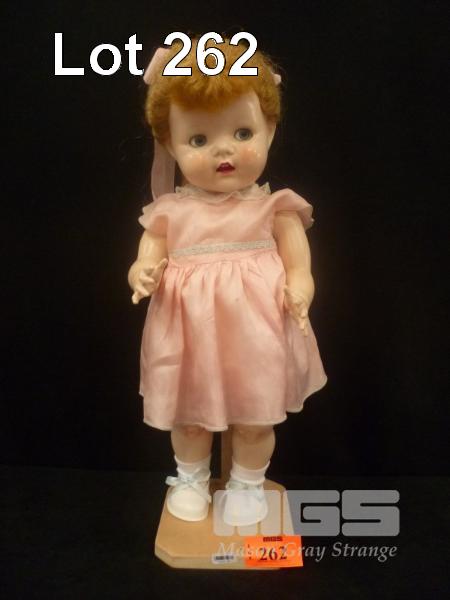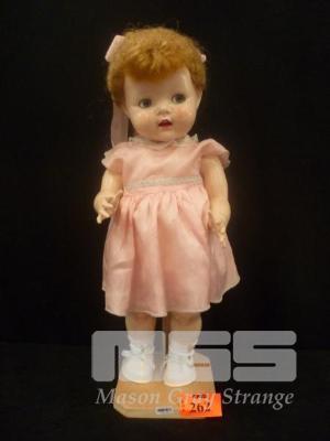 PEDIGREE DRESS DOLL ON STAND, PINK DRESS, PLATTED HAIR WITH SHOES, 21"