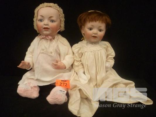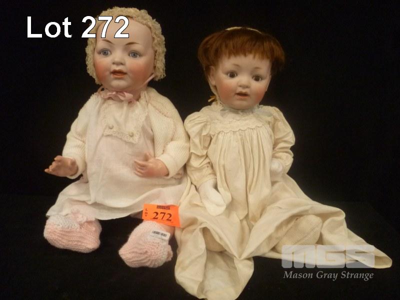 2 x EARLY BISQUE DRESS DOLLS, LINEN DRESSES, BONNETS & BOOTIES, 1 x JDK GERMANY MARKED 13-211, 1 x UNMARKED