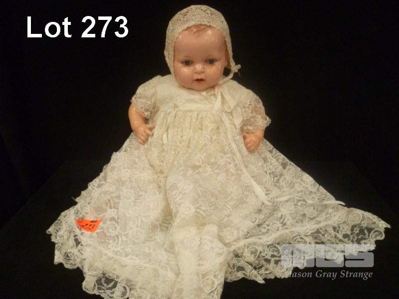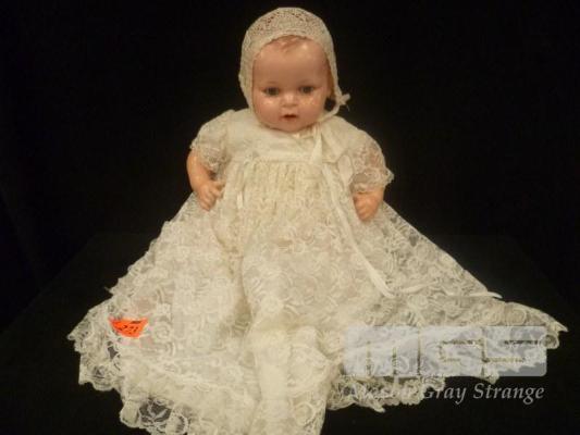 EARLY DRESS DOLL, UNMARKED, LACEWORK DRESS & BONNET