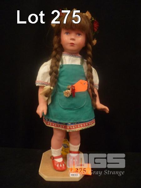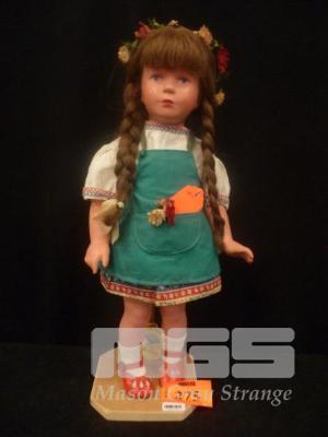 VINTAGE KATHE KRUSE GERMAN CHILD DRESS DOLL ON STAND, 15" WITH TRADITIONAL CLOTHING WITH ORIGINAL TAG