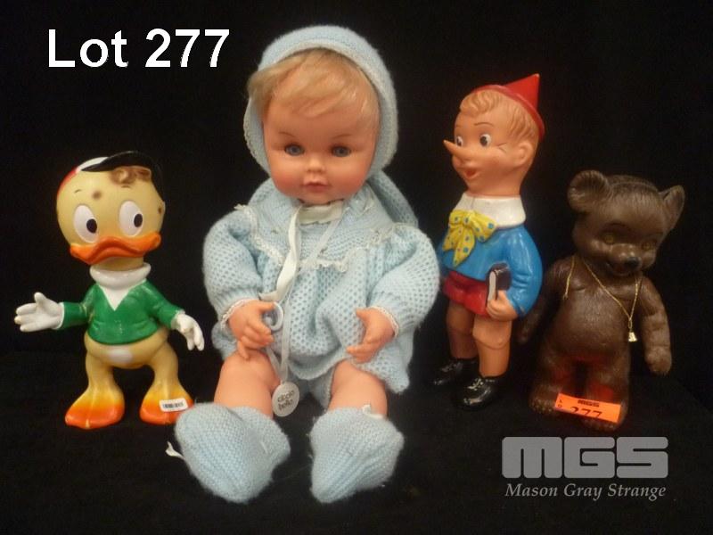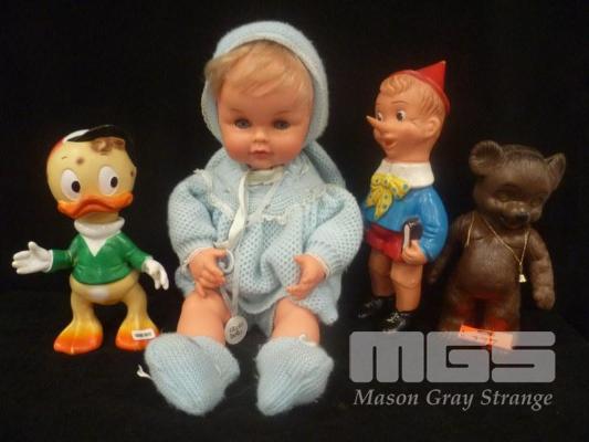 3 x EARLY PLASTIC TOYS, BEAR UNMARKED, DUCK MARKED WALT DISNEY PRODUCTIONS 1962, PINOCCHIO MARKED RUBBER TOYS MADE IN ITALY