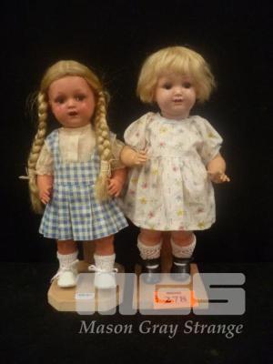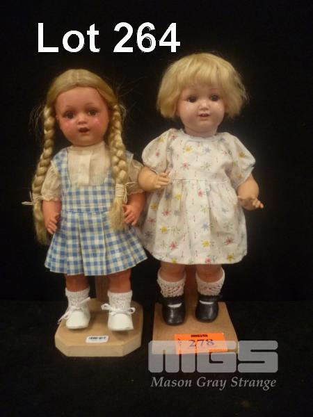 2 x EARLY GIRL DRESS DOLLS ON STANDS, 1 x MARKED GERMANY 728/2 29/31, 1 x MARKED K&W GERMANY 298/2