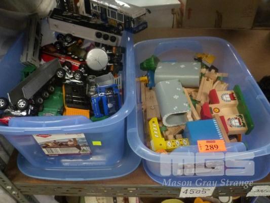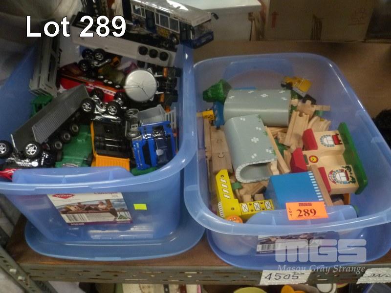 TIMBER RAILWAY TRACK SET, TUNNELS, TRACK, TRAINS, DIORAMA, TUB OF TRUCKS, CARS & TOYS