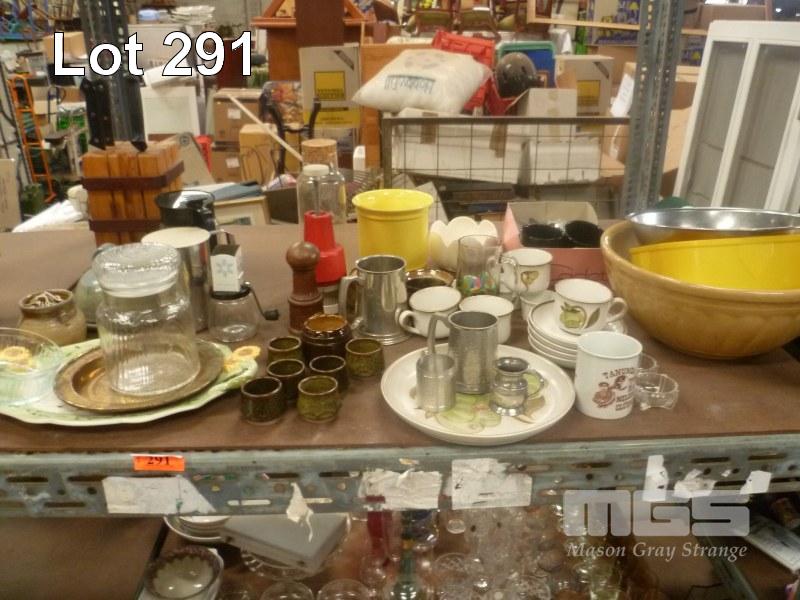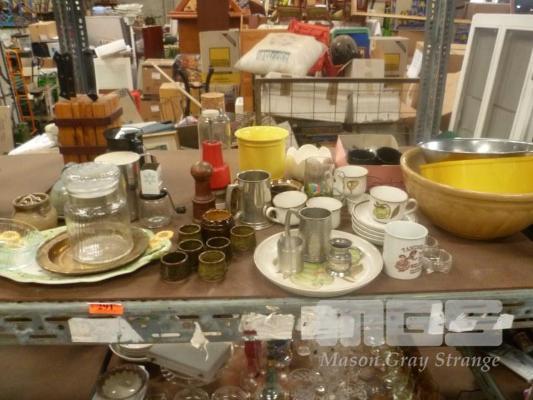 ASSORTED KITCHENWARE INC POTTERY CUP SETS, PEWTER,E TC, 1 x SHELF