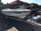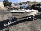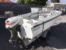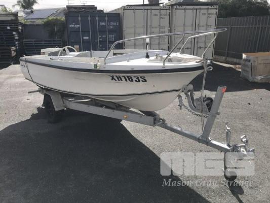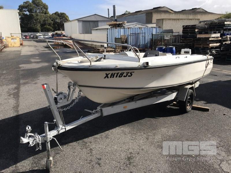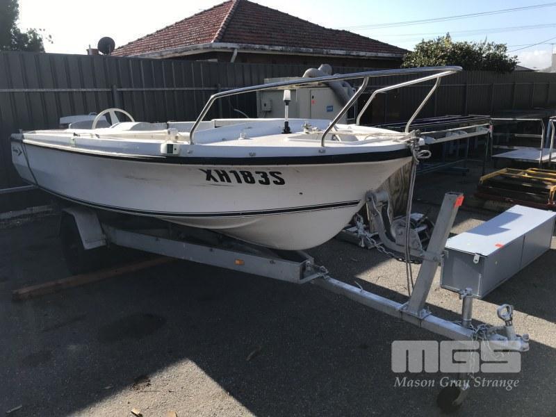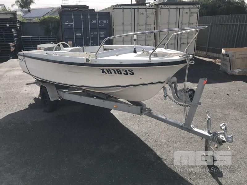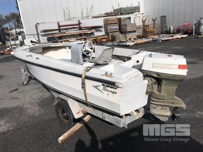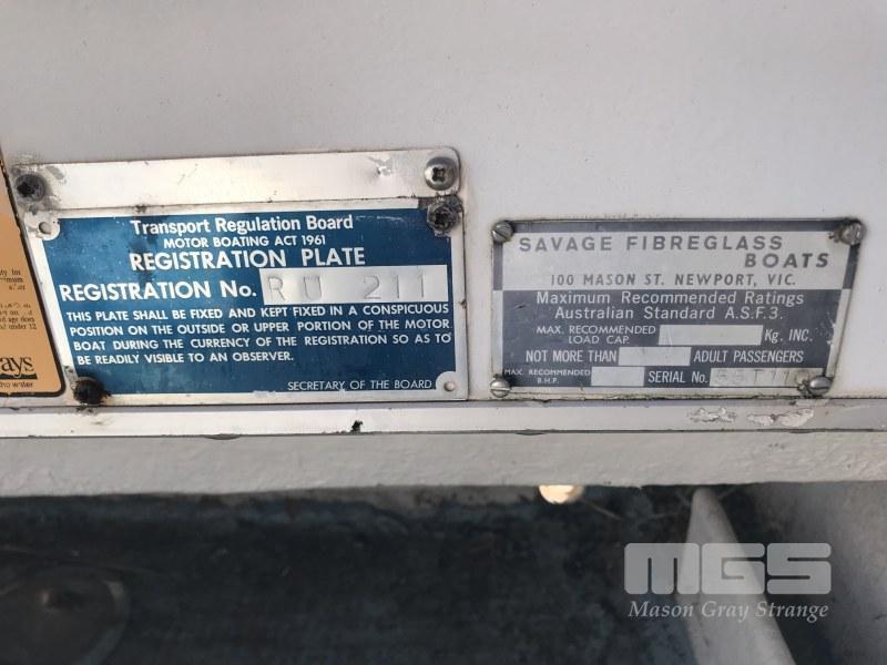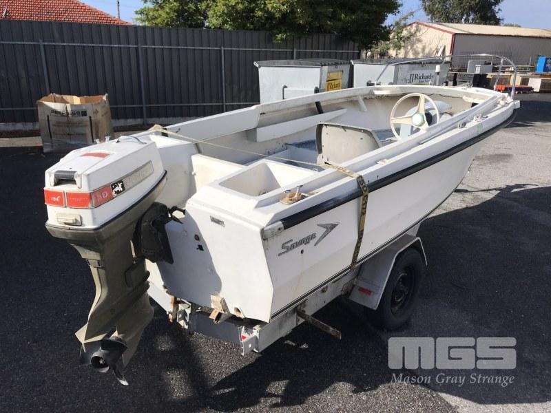 16' FIBREGLASS RUNABOUT, SAVAGE TASMAN HIN: AUTSA022812DK6 DOM: 1975 MARINE REG; XH183S 50HP JOHNSON OUTBOARD SINGLE SEAT, BAIT BOARD (WITH REG PAPERS) ON SINGLE AXLE TILTING TRAILER NO REG NO VIN CONDITION: MOTOR NOT ATTACHED TO CONTROLS NO THROTLLE PAINT LIFTING CRACKING ALONG GUN RAIL