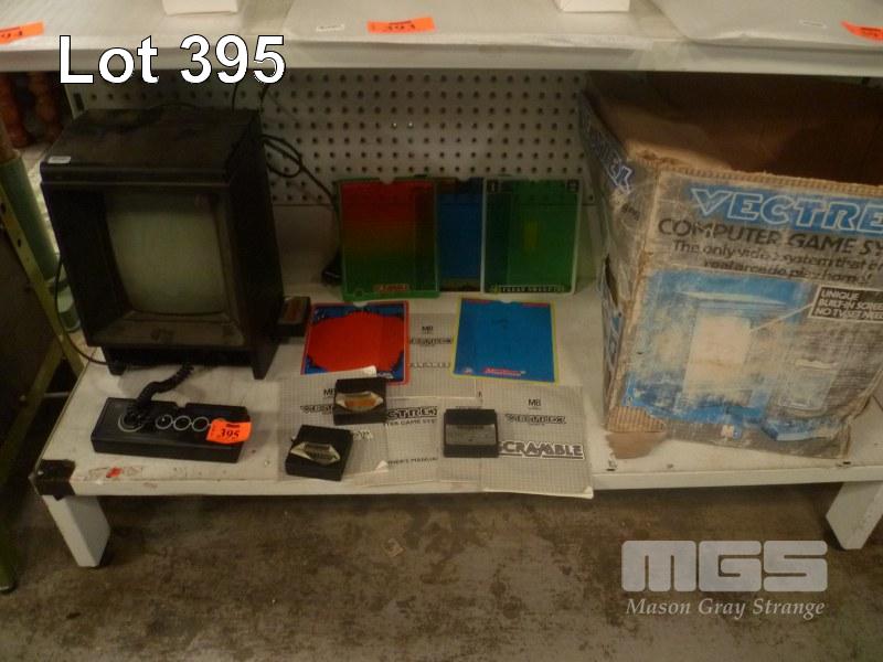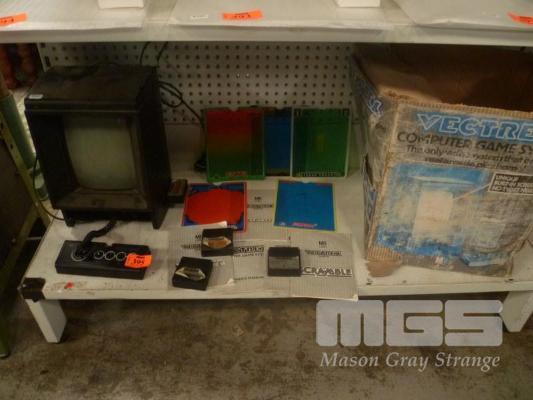 VECTREX COMPUTER GAMES SYSTEM (SCREEN FAULT) WITH GAME CARTRIDGES, SCRAMBLE CLEAN SWEEP, COSMIC CHASM & BEZERK