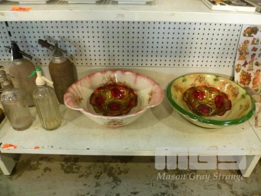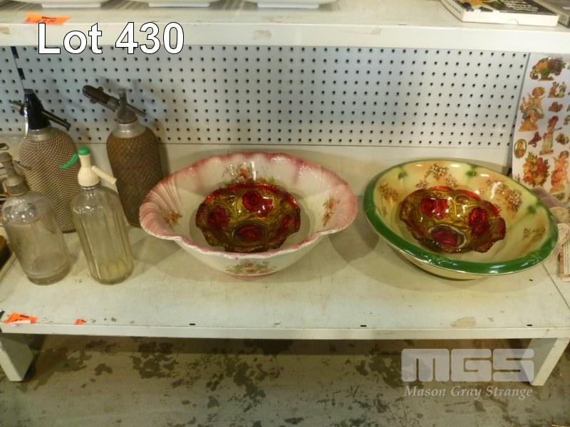 4 x SODA STREAM BOTTLES, 2 x LARGE CERAMIC WASH BASINS WITH 2 x RED/GOLD SALAD BOWLS