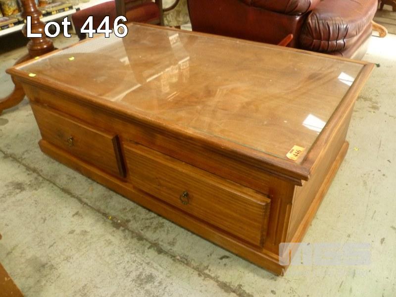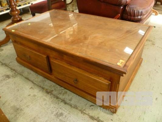 TIMBER COFFEE TABLE WITH GLASS TOP, 2 x DRAWER