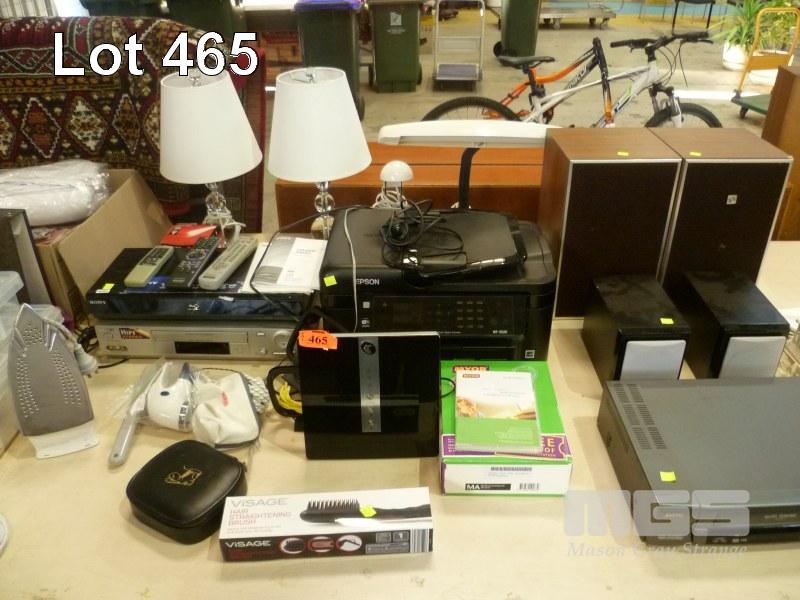 ASSORTED TABLE LAMPS, EPSON PRINTER, SONY BLU-RAY & SONY VCR WITH REMOTES, IRONS, TELSTRA MODEM , ETC