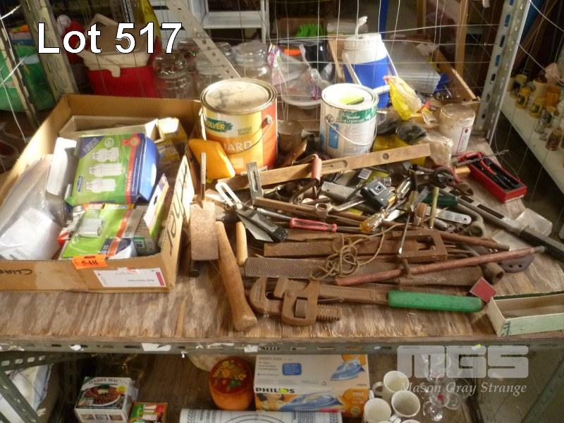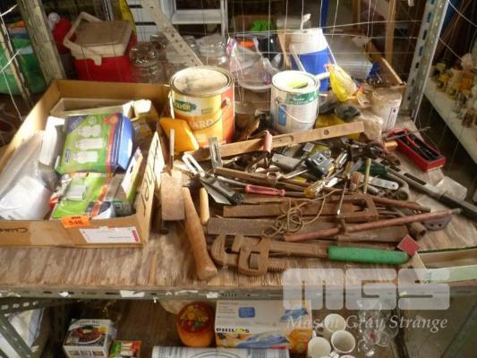 ASSORTED TOOLS INC FILES, PLUMBERS WRENCH, LEVEL, HAMMERS, ETC & 1 x BOX LIGHT BULBS, (1 x BAY)
