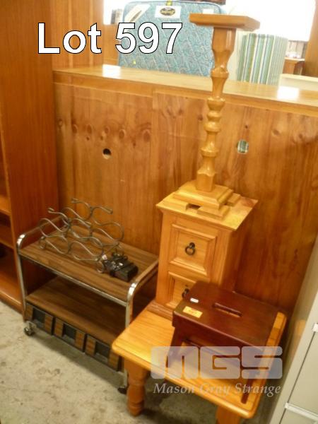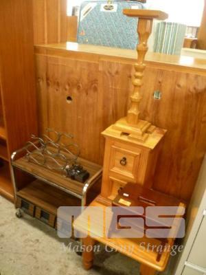 ASSORTED PINE FURNITURE, INC WINE RACK, ALARM CLOCK, TROLLEY, COFFEE TABLE, HALL STAND, ETC