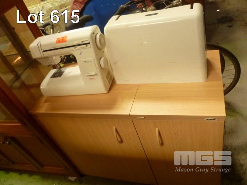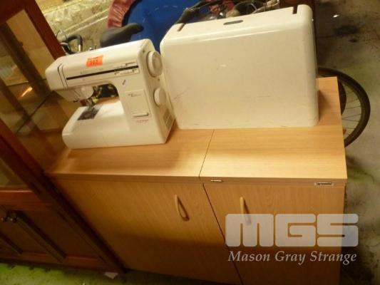 SEWING CABINET ON CASTORS, HYDRAULIC LIFT & JANOME SEWING MACHINE WITH ACCESSORIES