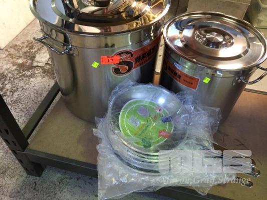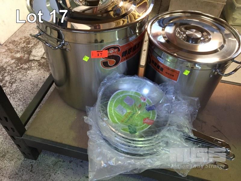2 x STAINLESS STEEL STOCK POTS, 45 & 35cm & 10 x FRY PANS