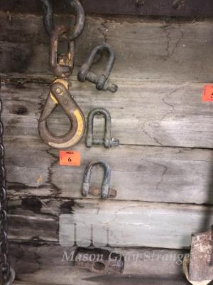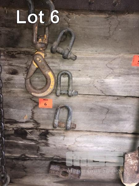 6 x LARGE GALV SHACKLES, 1 x LIFTING HOOK