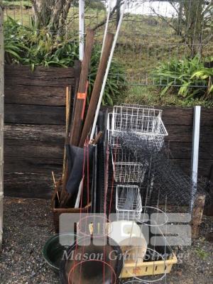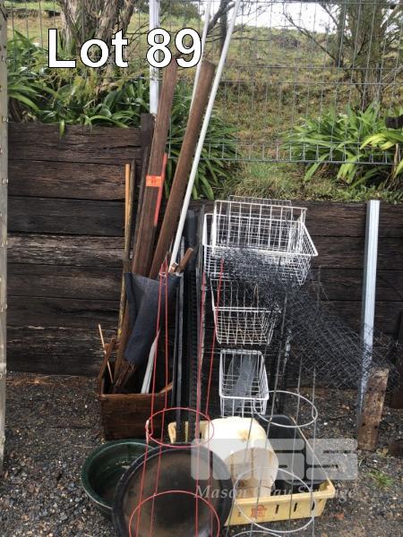 ASSORTED SURPLUS ITEMS, WIRE BASKETS, STOCK FEEDERS, PLANT FRAMES, GARDEN STAKES etc.
