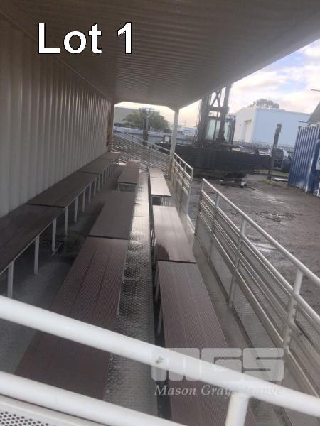 TRANSPORTABLE 3 TIER GRANDSTAND 40' (12.20m) (L) APPROX x 8' (2.40m) (W) x 9.44' (2.88m) (H) COMPOSITE DECK SEATING WITH STEEL FRAMES APPROX 60 PERSON SEATING CAPACITY, SAFETY HAND RAILING, ROOF & BACK WALL, OPEN FRONT & SIDES, FITTED WITH CONTAINER PIN SOCKETS