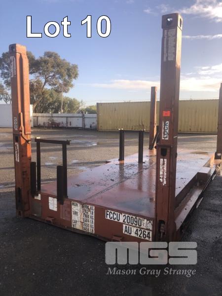 20' CONTAINER SHIPPING BASE, FLAT RACK. 4 x CORNER FOLDED DOWN POSTS FORK POCKETS NO: FCCU20090 CAP: 32,050kg TARE: 2,950kg
