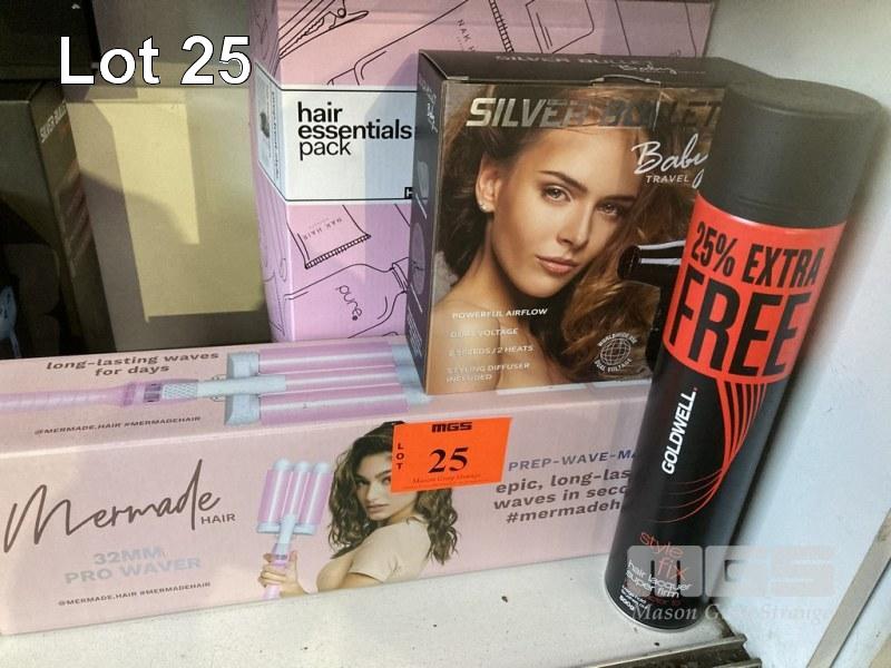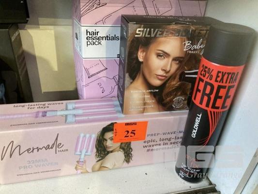 1 x HAIR ESSENTIALS PACK, 1 x 32mm MERMADE PRO WAVER, 1 x SILVER BULLET BABY TRAVEL DRYER & 1 x GOLDWELL STYLE FIX HAIR LACQUER