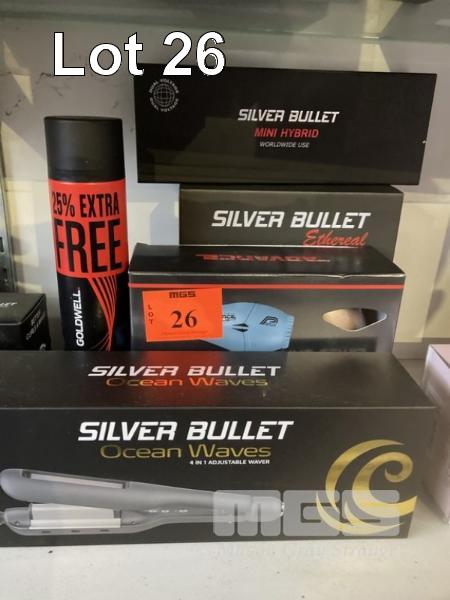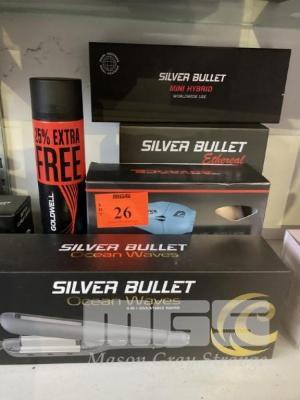 1 x SILVER BULLET OCEAN WAVES 4 IN 1 ADJUSTABLE WAVER, 1 x PARLUX ADVANCE HAIRDRYER, 1 x SILVER BULLET HYBRID BRUSH & 1 x SILVER BULLET ETHEREAL PROFESSIONAL HAIRDRYER