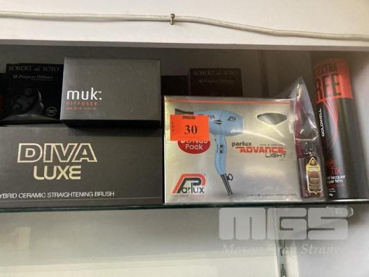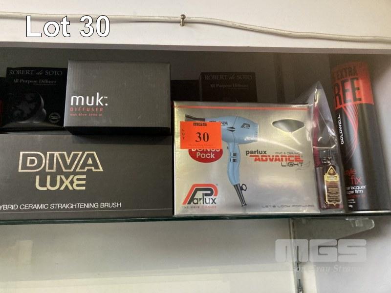 1 x DIVA LUXE HYBRID CERAMIC STRAIGHTENING BRUSH, 1 x PARLUX ADVANCE LIGHT HAIRDRYER PACK, MUK DIFFUSER BLOW 3900 IR & 1 x GOLDWELL STYLE FIX HAIR LACQUER