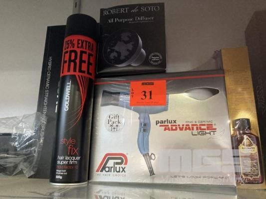 1 x DIVA LUXE HYBRID CERAMIC STRAIGHTENING BRUSH, 1 x PARLUX ADVANCE LIGHT HAIRDRYER PACK, ROBERT DE SOTO ALL PURPOSE DIFFUSER & 1 x GOLDWELL STYLE FIX HAIR LACQUER