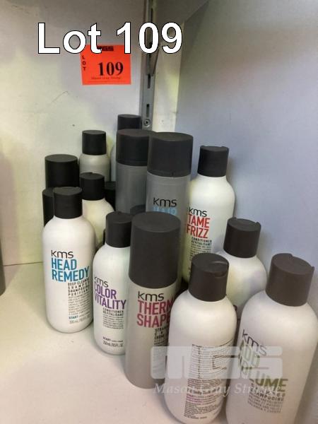 20 x BOTTLES ASSORTED KMS HAIR PRODUCTS INCLUDING COLOR VITALITY, ADDS VOLUME SHAMPOO, THERMA SHAPE, MOIST REPAIR GEL & HAIR STAY