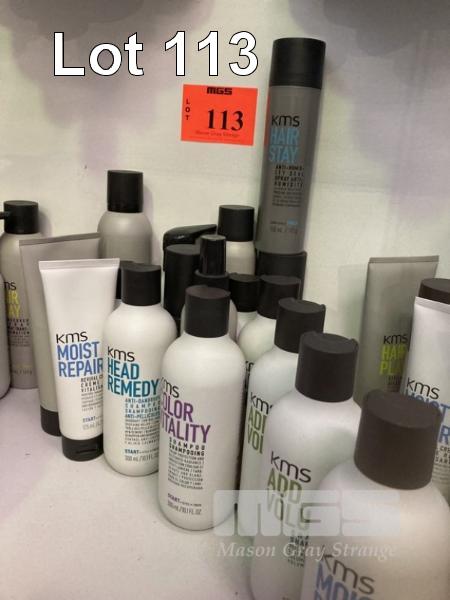 20 (APPROX) x BOTTLES ASSORTED KMS HAIR PRODUCTS INCLUDING COLOR VITALITY, ADDS VOLUME SHAMPOO, THERMA SHAPE, MOIST REPAIR GEL & HAIR STAY