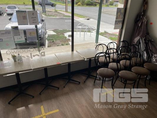 4 x CAFE TABLES, 600 x 600mm, ACRYLIC TOP & 10 x CAFE CHAIRS, BLACK TUBULAR STEEL FRAME