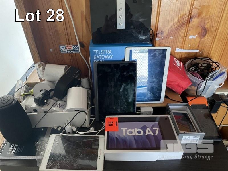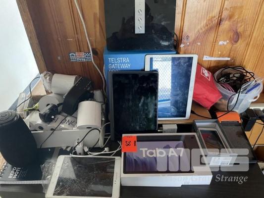 ASSORTED OFFICE EQUIPMENT COMPRISING SAMSUNG GALAXY MOD: SM-T500 S/NO: R9WR402FTSJ 3GB, 32GB, WIFI SAMSUNG TABLET SM-T805Y (NO CHARGER) SAMSUNG MINI TABLET, CRACKED SCREEN (NO CHARGER) ASPERA JAZZ 2 MOBILE PHONE, (NO CHARGER), DAB RADIO, BLUETOOTH SPEAKER, FIRST AID KIT, ETC