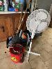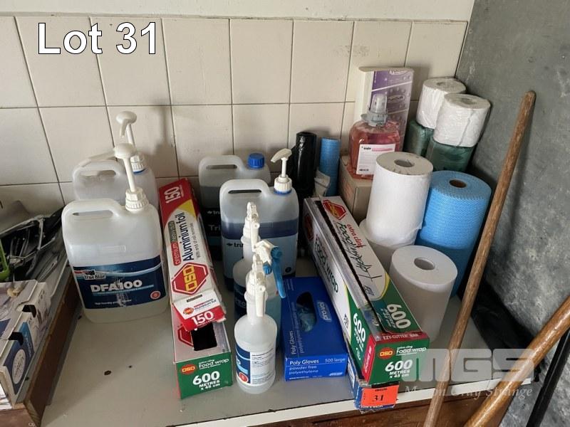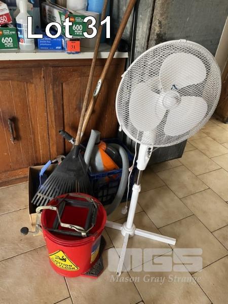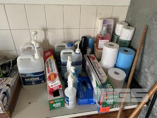 QUANTITY ASSORTED CLEANING EQUIPMENT & PRODUCTS, VACUUM FAN, BUCKET, TOILET PAPER, CLEANING SOLUTIONS, CHUX, ALFOIL, ETC